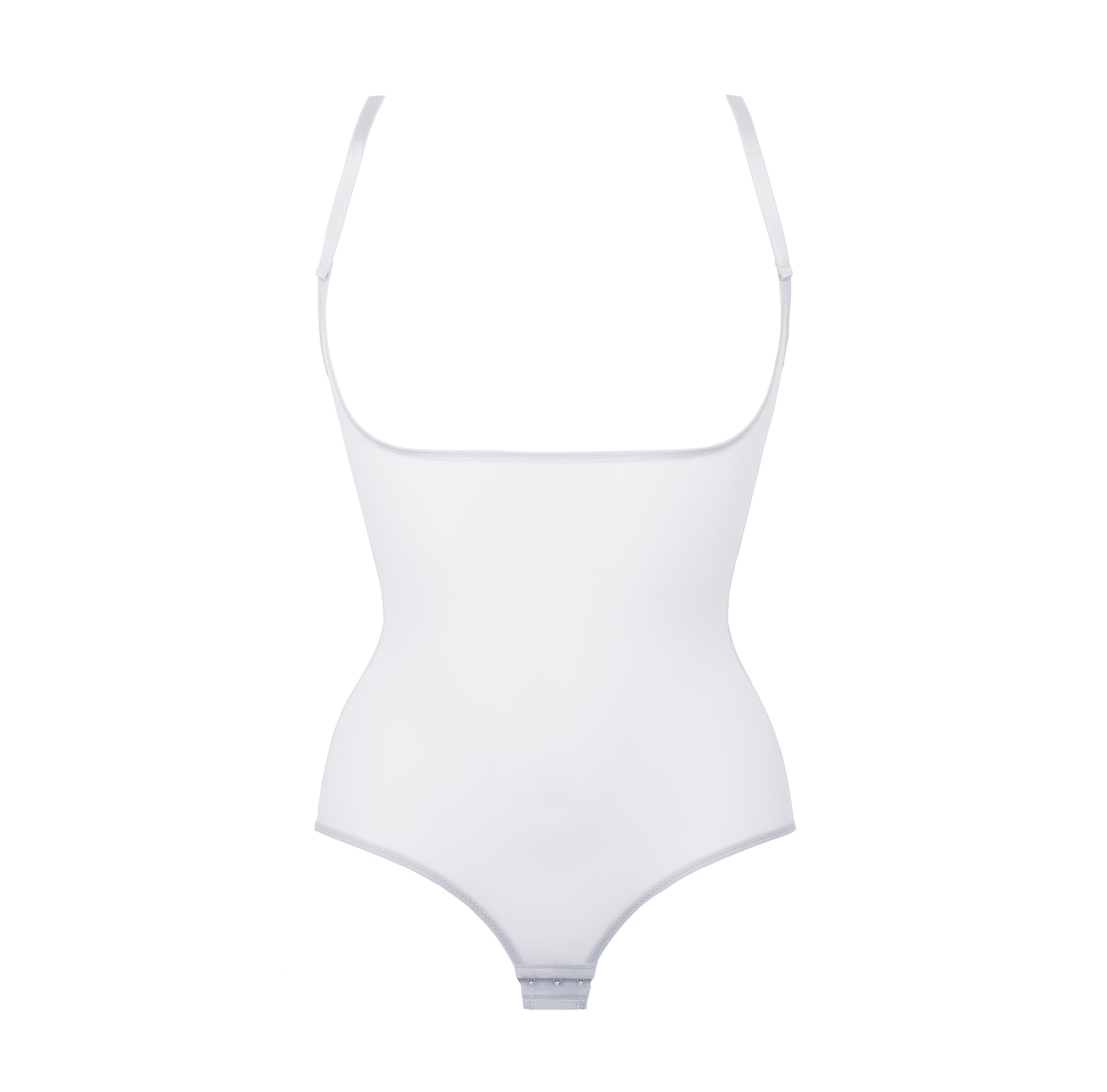 Modelujące body wykonane jest z gęsto usianych elastycznych włókien. Wycięcie pod biustem pozwala na dobór ulubionego stanika.