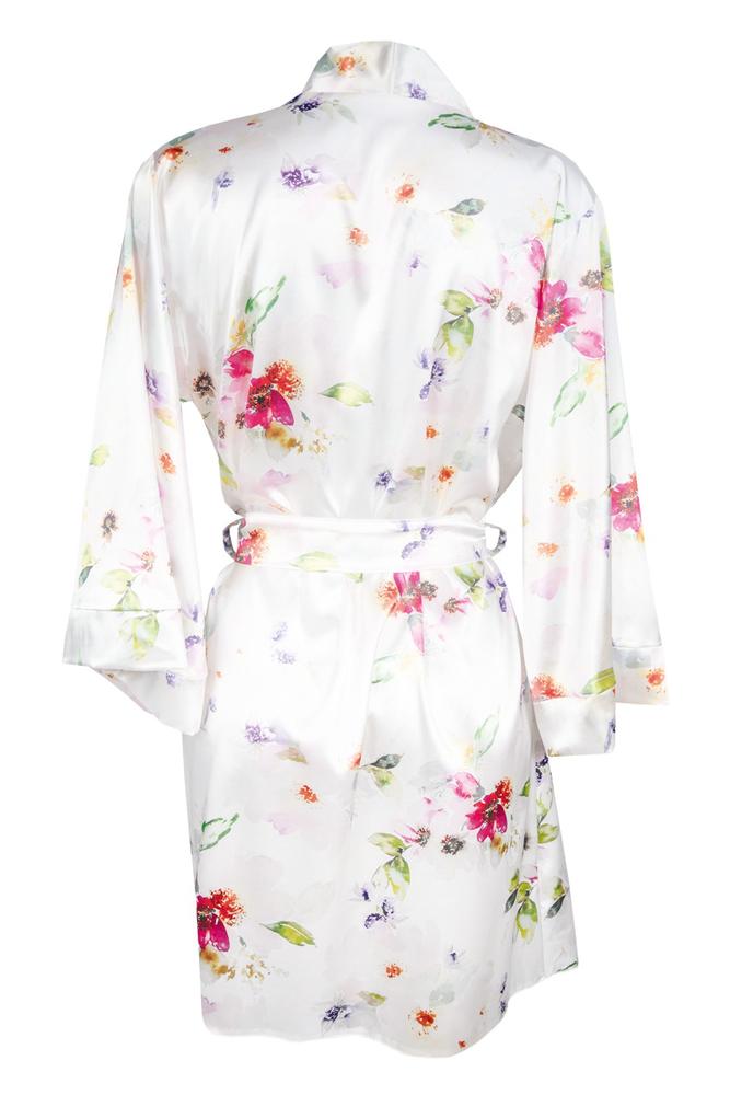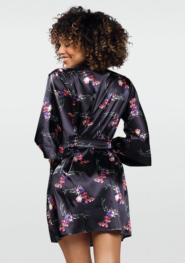 Kwiatowy styl i elegancja. Podomka z kolekcji Flowers to obowiązkowa pozycja po wieczornej kąpieli. Szlafrok jest uszyty z delikatnej satyny z nadrukowanym kwiatowym nadrukiem. Podomka sięga do połowy ud oraz posiada kimonowe rękawy. Po bokach szlafroczka znajdują się dwie szlufki, dzięki którym można przełożyć pasek.