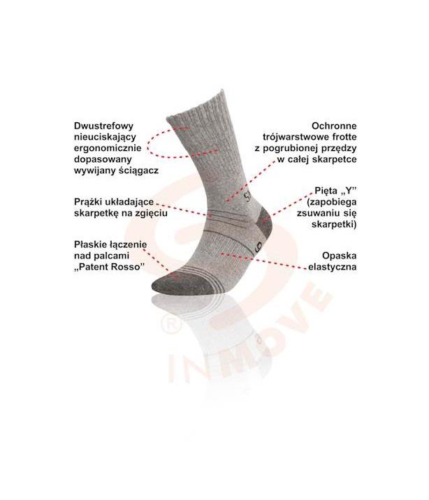 Unikalne właściwości naturalnej wełny merynosowej zapewniają utrzymywanie ciepła oraz absorpcję nadmiaru wilgoci, dzięki czemu stopy pozostają zawsze suche. Merynos to nie tylko oddychalność, ale i komfort cieplny. Dodatek włókien LYCRA® w całym wyrobie zapewnia znakomite przyleganie do nogi, a dodatkowe jony srebra gwarantują właściwy zapach po użytkowaniu.